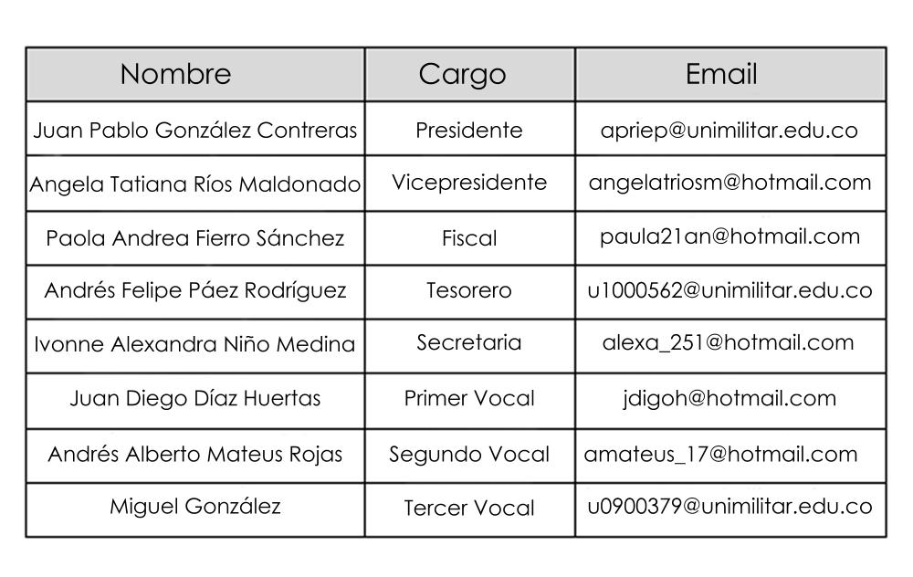 Como miembros vitalicios de la comunidad neogranadina, los Profesionales en Relaciones Internacionales y Estudios Políticos, bajo la representación de APRIEP, invitamos a que las autoridades de la Universidad Militar Nueva Granada valoren las capacidades humanas y profesionales que han formado en sus instalaciones y apoyen decididamente el talento que está sin explotar, y que consideramos es la gran deuda de la Universidad para con sus egresados.