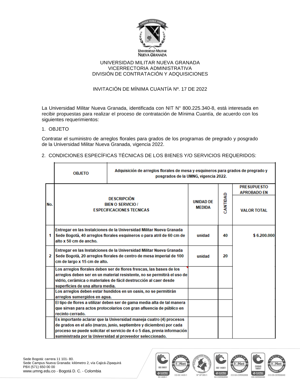 - Contratar el suministro de arreglos florales para grados de los programas de pregrado y posgrado de la Universidad Militar Nueva Granada, vigencia 2022