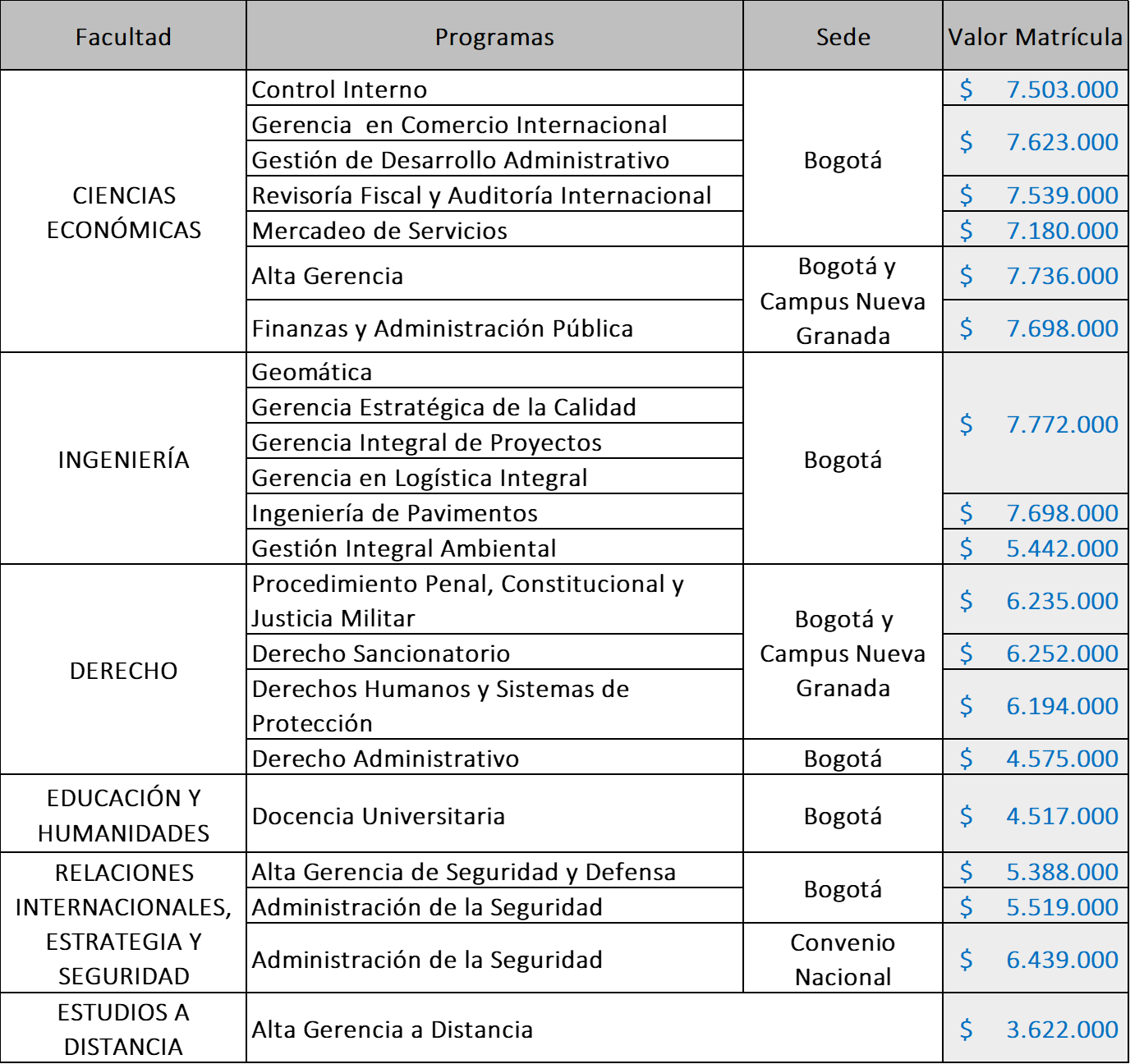 Facultades sede Bogotá