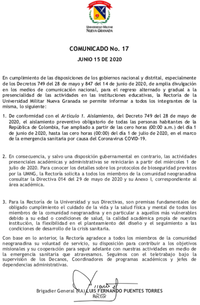 Protocolos que establecen medidas de bioseguridad para el retorno a las actividades presenciales a la Universidad Militar Nueva Granada