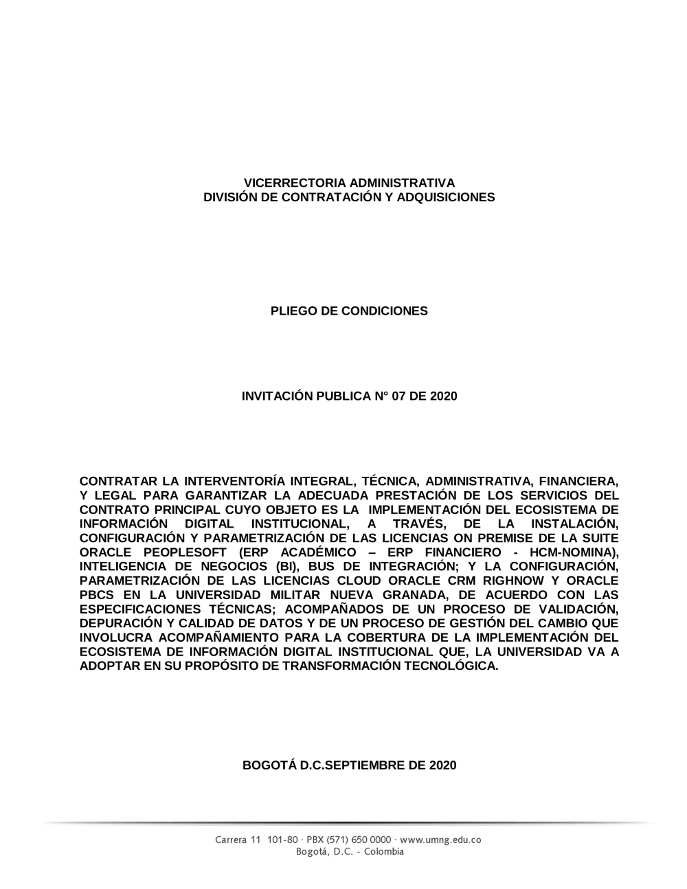 - PLIEGO DE CONDICIONES INVITACIÓN PÚBLICA No. 07 DE 2020