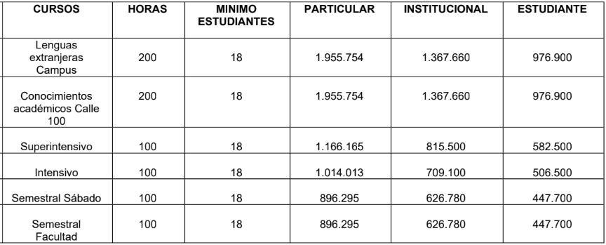 PROGRAMAS ACADEMICOS DE IDIOMAS, CURSOS DE IDIOMAS Y COSTOS.Resolución 01-0034 de 2022 - Programas Académicos Sede Calle 100 (proferida por la secretaria de Educación de Usaquén). Resolución 456 de 2023 - Programas Académicos Sede Campus (proferida por la secretaria de Educación de Cundinamarca). Resolución No. 1981-2024 - Costos Cursos de Idiomas (Vigencia 2025) |
