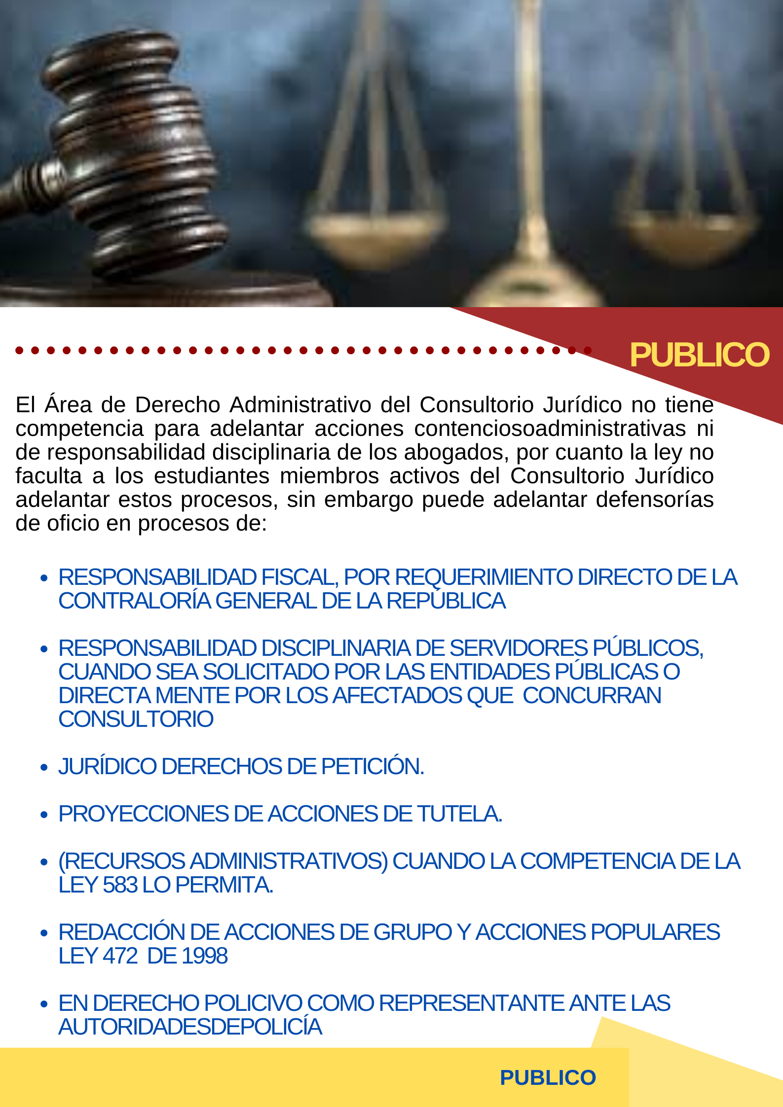 Dentro del marco de competencias se manejan temas en las áreas de público, penal, privado y laboral, a través de los estudiantes de últimos semestres y acompañados de los docentes abogados especializados en cada una de las ramas.