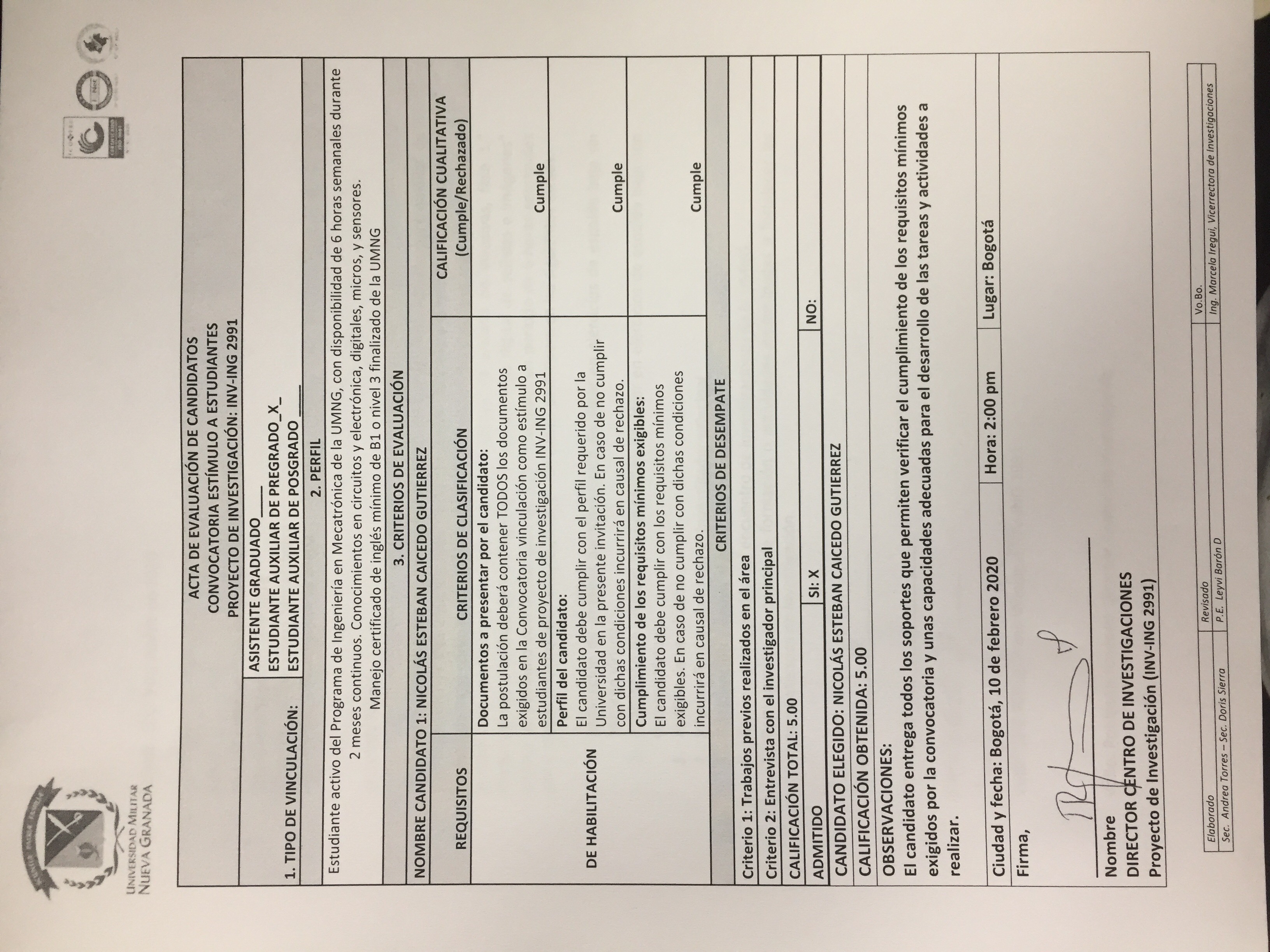 - Convocatoria de un Auxiliar de Investigación en Pregrado, proyecto ING 3190 Ver / Respuesta Ver