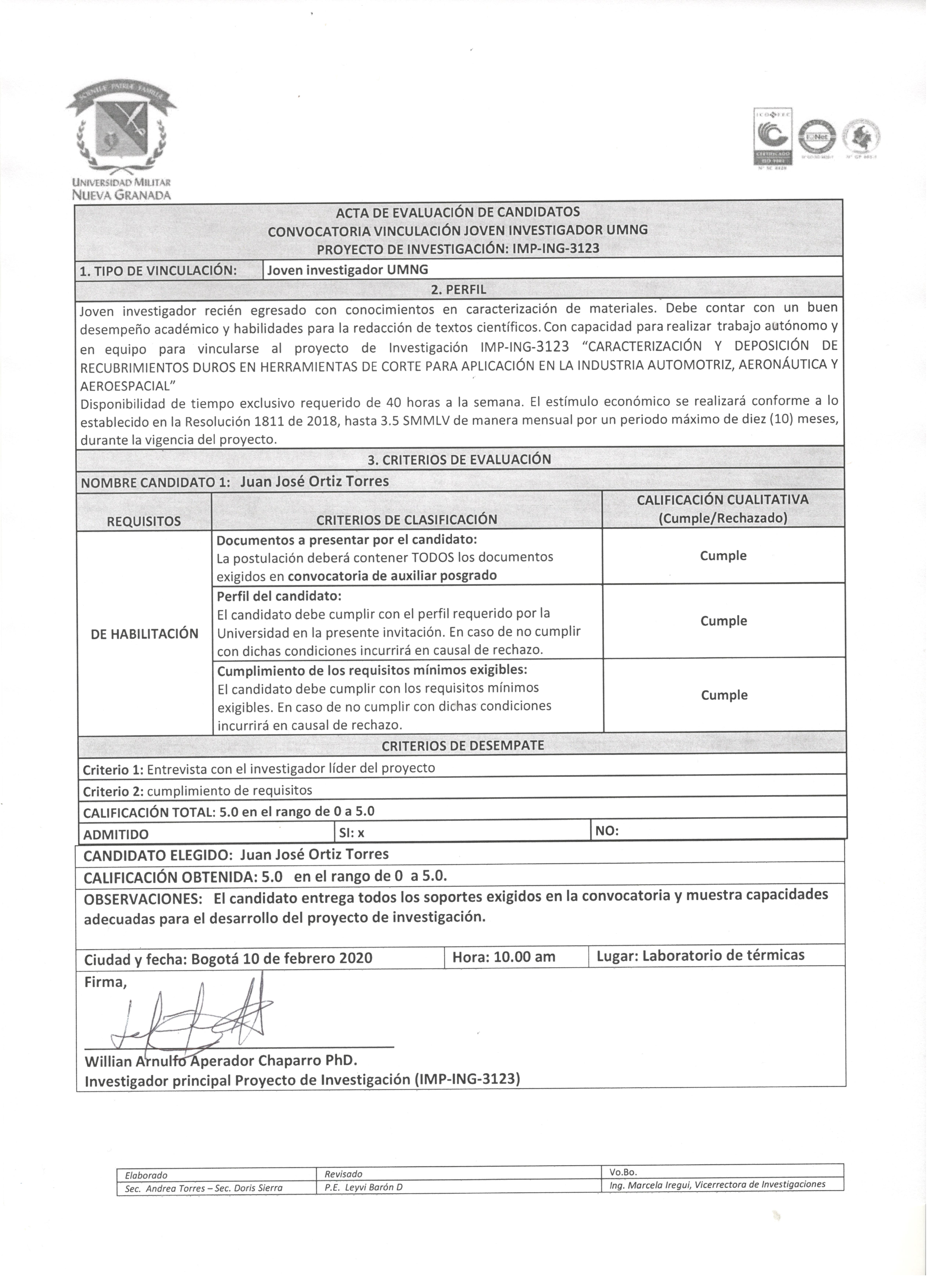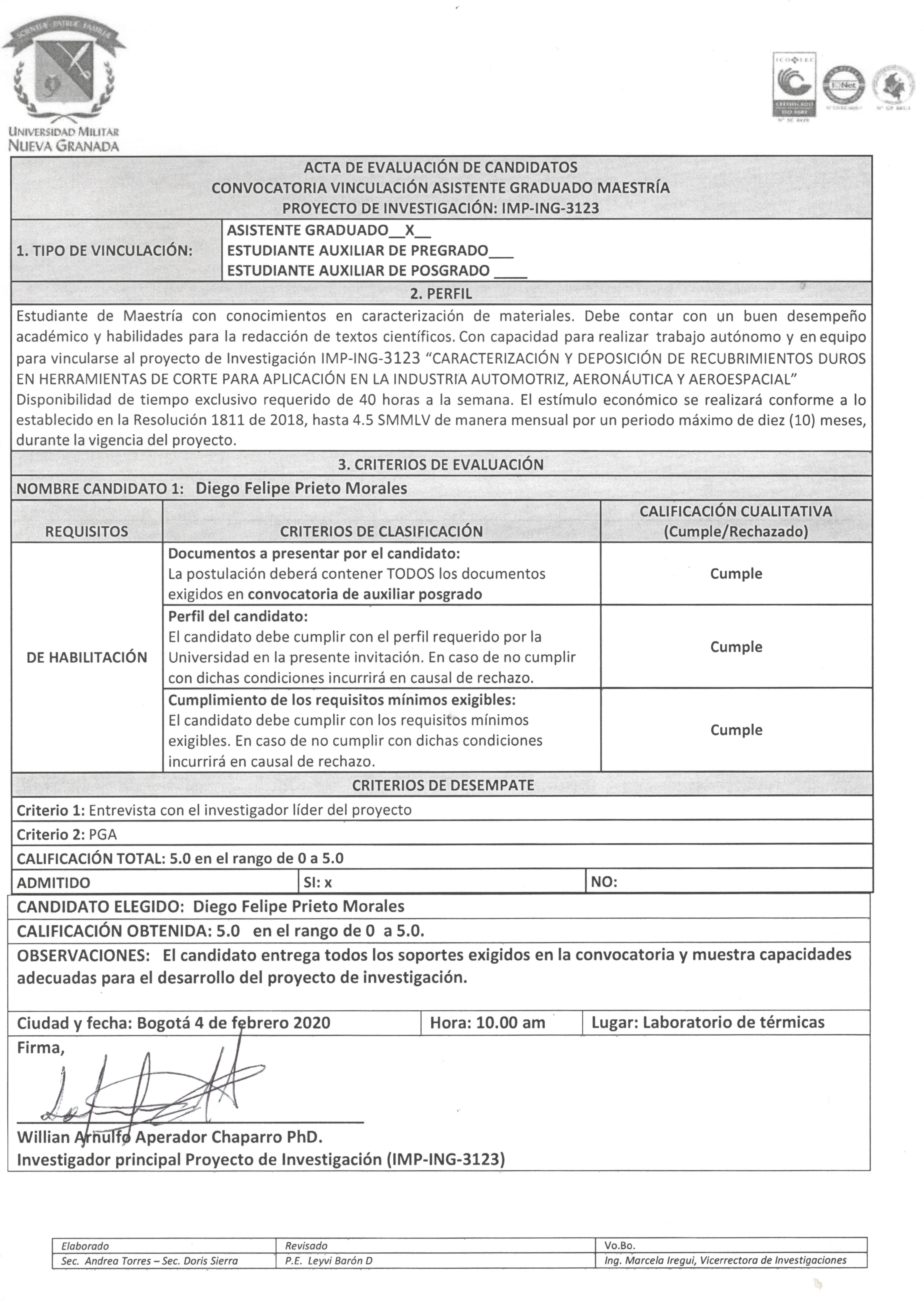 - Acta de Evaluación del Auxiliar de Posgrado, del Proyecto ING 3488 Ver