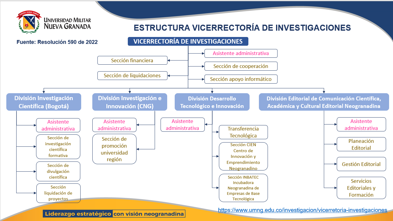 Resolución 1209 de 23 de agosto de 2024. Por lo cual se reglamenta la vinculación de personal a los proyectos de investigación, innovación y emprendimiento financiados o cofinanciados. Ver Resolución 1410 de 18 de septiembre de 2024. Por la cual se reglamenta el otorgamiento del estímulo a la investigación científica para los estudiantes de pregrado que desarrollen actividades de Ciencia, Tecnología e Innovación. Ver Resolución 1433 de 19 de septiembre de 2024. Por medio de la cual se establecen lineamientos y requisitos para el otorgamiento de apoyos económicos a estudiantes de pregrado y posgrado. Ver Resolución 1441 de 20 de septiembre de 2024. Por la cual se reglamenta el otorgamiento del estímulo a la investigación científica para los estudiantes de posgrado que desarrollen actividades de Ciencia, Tecnología e Innovación. Ver Directiva No 0061 de 1 de enero de 2024. Impartir instrucciones para el funcionamiento del Hub de Innovación de la Universidad Militar Nueva Granada, en sus sedes de Bogotá y Campus Nueva Granada