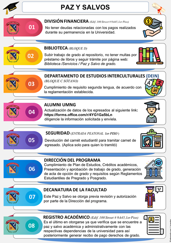 La División de Admisiones, Registro y Control Académico no es responsable del trámite de paz y salvos de otras dependencias. Para mayor información, consulte el instructivo correspondiente.
